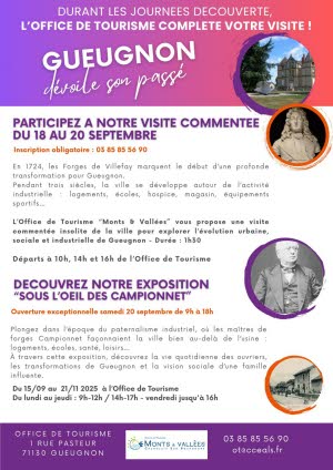 L'Office de Tourisme Monts & Vallées a le plaisir de vous rappeler les deux événements consacrés à l'histoire de Gueugnon actuellement en cours ou à venir.