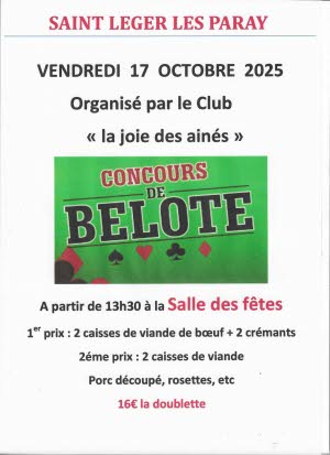 Saint-Léger-lès-Paray - Concours de belote Organisé par le club "La joie des aînés". 1er prix : 2 caisses de viande de bœuf + 2 crémants; 2e prix : 2 caisses de viande; porc découpé, rosettes, etc. 16€ la doublette.