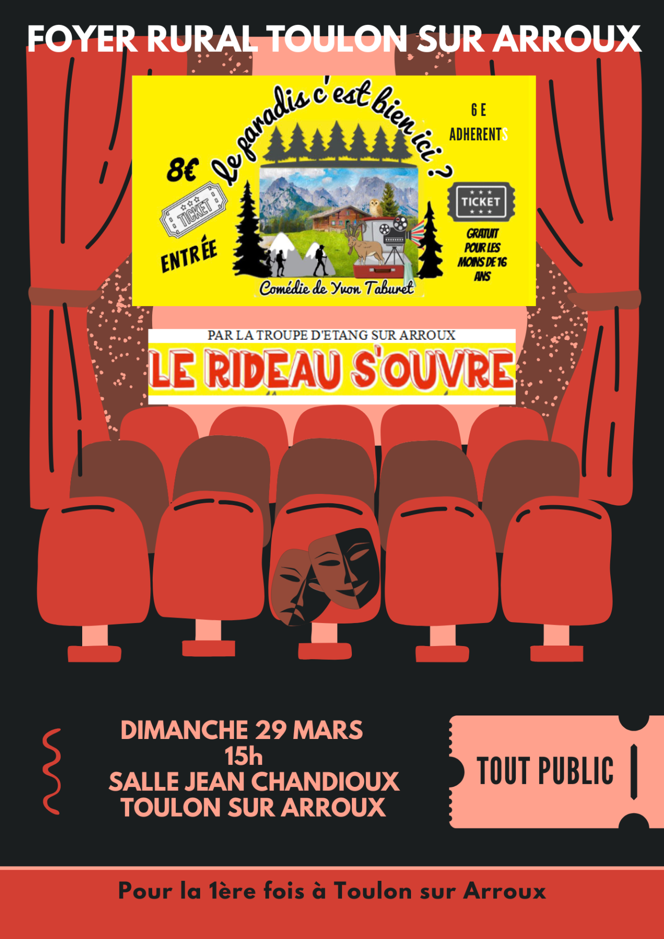 "Le rideau s'ouvre", troupe d'Etang sur Arroux vous présente « Le Paradis c'est bien ici », une comédie en 3 actes d'Yvon Taburet, où comment Lucas Belmont, célèbre acteur de cinéma, se retrouve au Paradis (gîte de montagne). Croyant avoir trouvé le havre de paix idéal, il va vite déchanter car ce lieu est beaucoup plus fréquenté qu'il n'y paraît.
